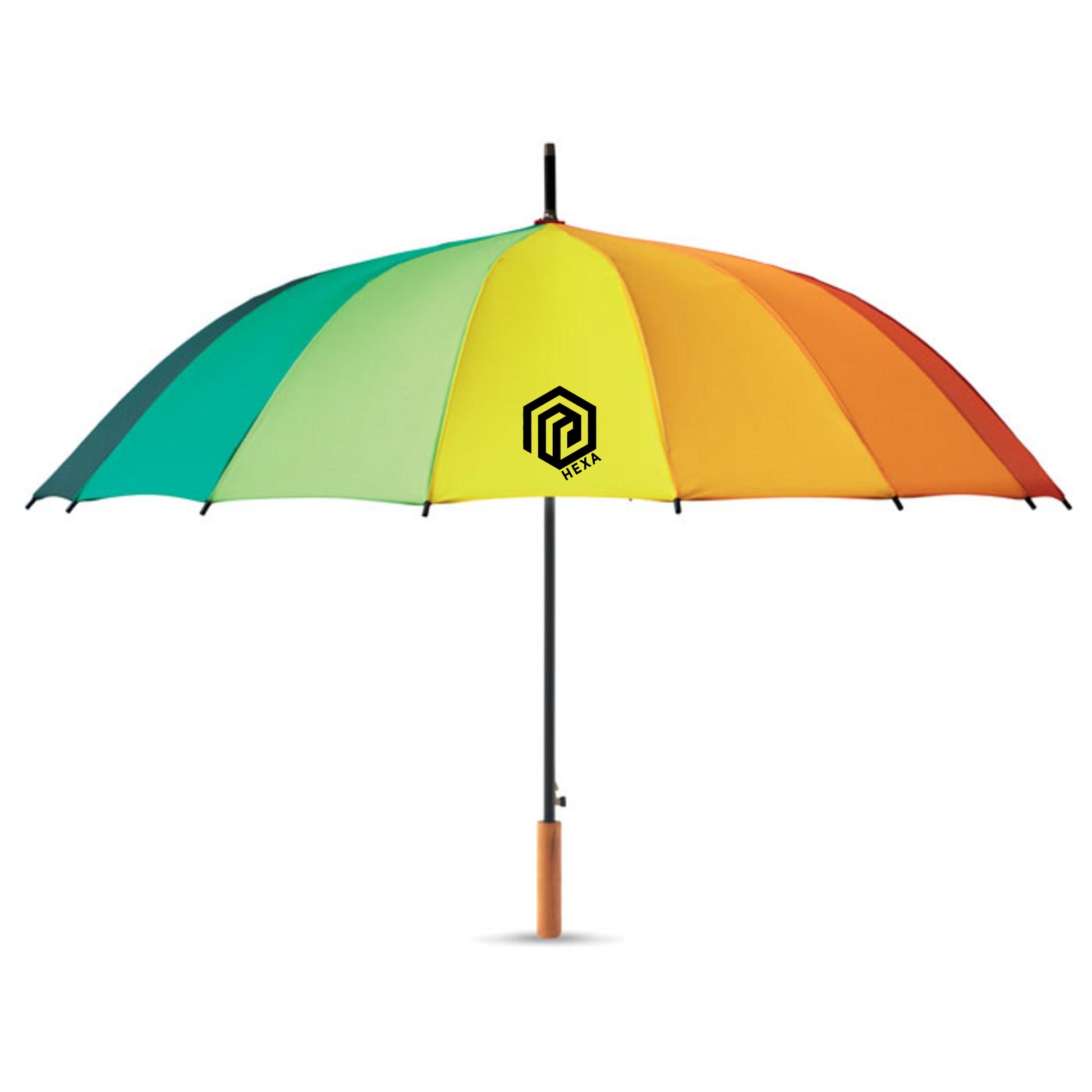 Get ready to make a splash with the ultimate corporate branding gift – our fabulous 27-inch rainbow auto open umbrella. It's not just any old umbrella; it's a colorful statement piece! Made from durable 190T Pongee, it features a wooden shaft and resilient fiberglass ribs. But here's where it gets even cooler – the black-plated metal tips and top add a touch of elegance, and with a whopping 16 panels, it's like a work of art. So, let's add a splash of style to your brand – slap your logo on this rainbow beauty and make your mark, rain or shine! ☂️🌈🌟😄