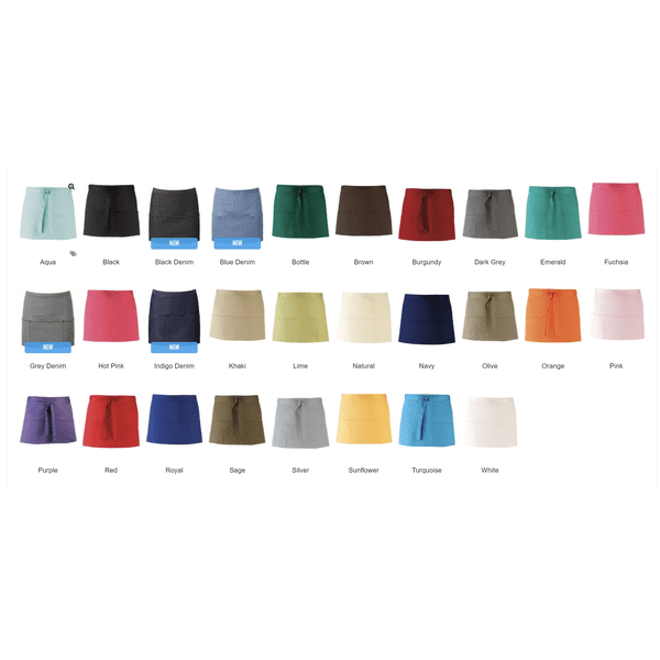 This short waist aprons comes in over 24 colours including denim. See images for colour selection.