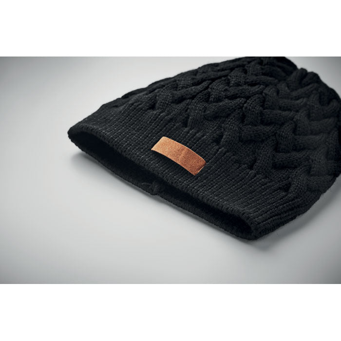 This stylish cable knit beanie is made from recycled PET plastic and features a knitted pattern that adds a touch of elegance. It also includes a contrasting label on the front, making it a perfect accessory for staying warm during colder days. This stylish beanie is a practical way to wear your brand in the cooler months.