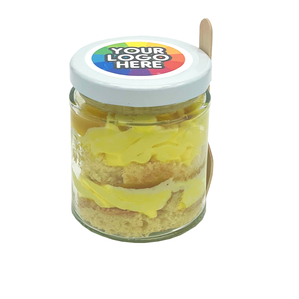 Our fantastic cake jars are available in flavours Jam & Cream, Lemon Drizzle, Strawberry Sundae, Caramel Chocolate and full colour branding on the jar or li or both. 5cm diameter.