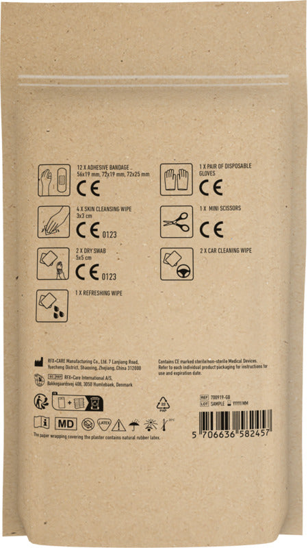 This Car First Aid Kit, presented in an elegant kraft brown FSC-certified paper pouch, is an essential companion for every journey. It includes 12 wash-proof plasters, cleansing and refreshing wipes, disposable gloves, a mini scissor, and more—each item compliant with EU safety standards. Designed for preparedness and peace of mind, it offers practical care for minor injuries on the road. The kit features full-colour branding, making it a refined choice for corporate giveaways that combine safety with sophistication.