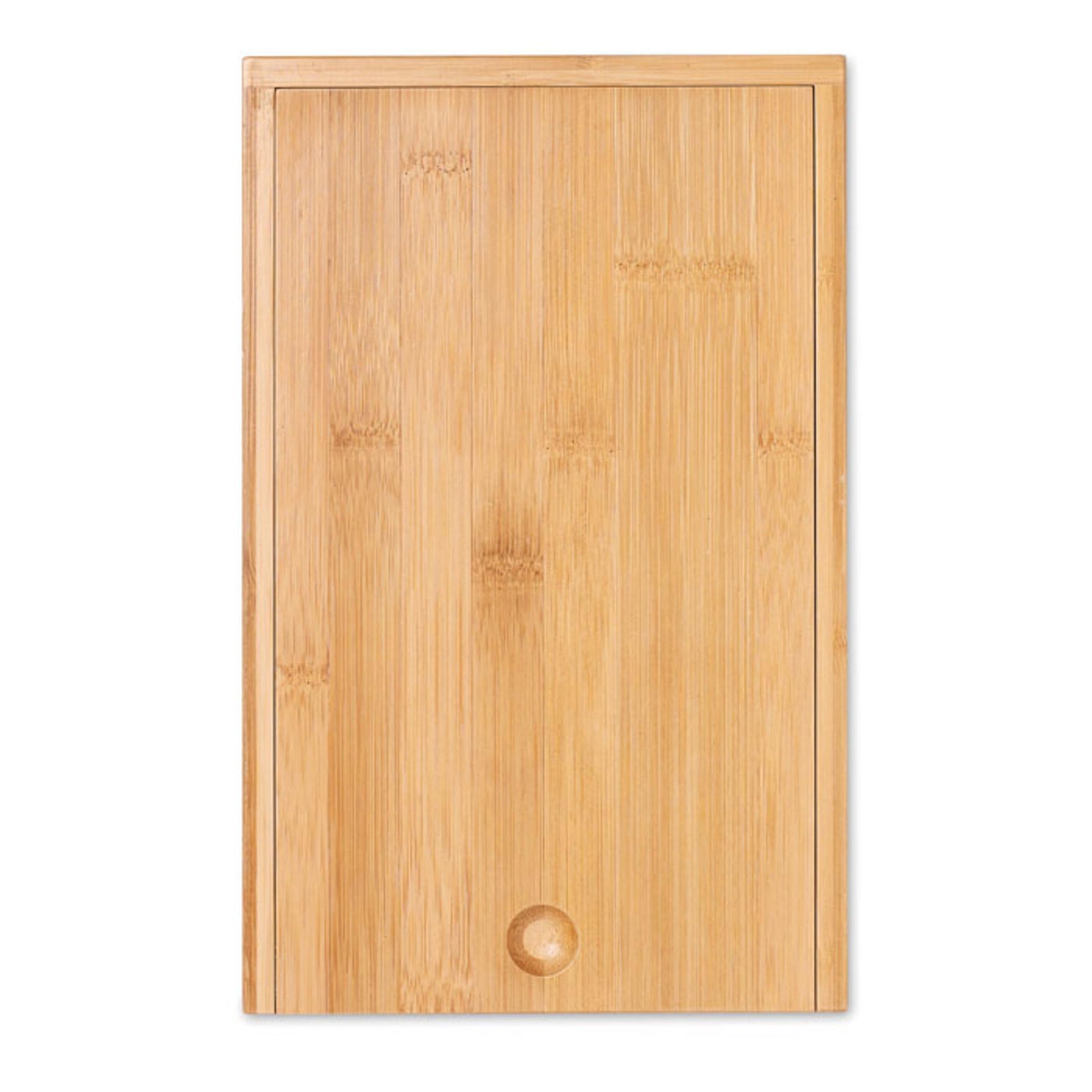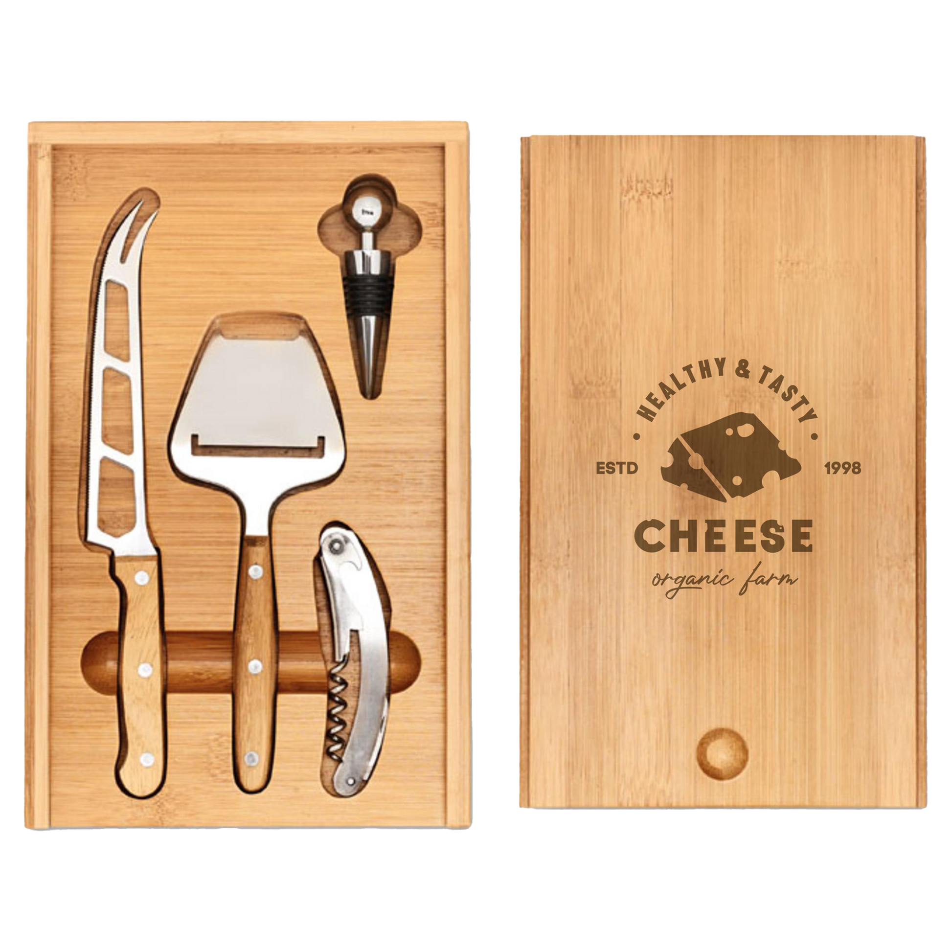 Inside this charming bamboo box, you'll find a stainless steel knife, a cheese peeler, a bottle opener, and a wine stopper. It's the perfect ensemble for wine and cheese lovers, making it an ideal choice for corporate gifting.