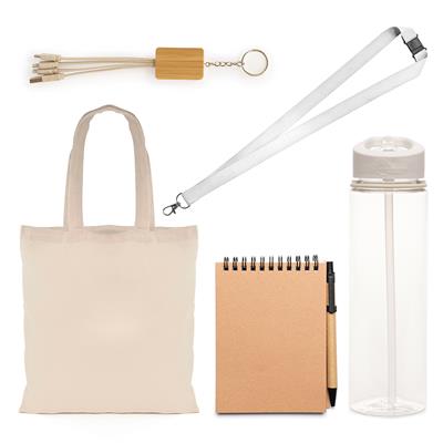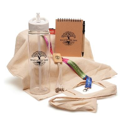 This refined gift set combines practicality with sustainability, featuring a natural 5oz cotton shopper alongside an Evander drinks bottle with a sleek white lid. It also includes an A6 Intimo recycled flip jotter paired with a matching recycled pen, a UK RPET lanyard, and a bamboo 3-in-1 charger. Ideal for premium corporate gifting or onboarding, this collection offers a sophisticated way to impress while supporting eco-conscious choices.
