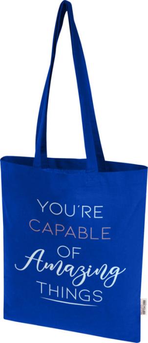 The Madras Blend Cotton Tote Bag combines sustainability with durability, crafted from 60% GRS certified recycled cotton and 40% GRS certified recycled polyester. With a sturdy 140 g/m² fabric and a 7-litre capacity, it comfortably supports up to 5kg, making it ideal for events, conferences, or everyday shopping. Its 30 cm shoulder handles ensure ease of carry, while GRS-certified print methods guarantee a fully transparent and responsible supply chain. Elegantly made in India, this tote offers a refined, eco-conscious choice for corporate giveaways or personal use.