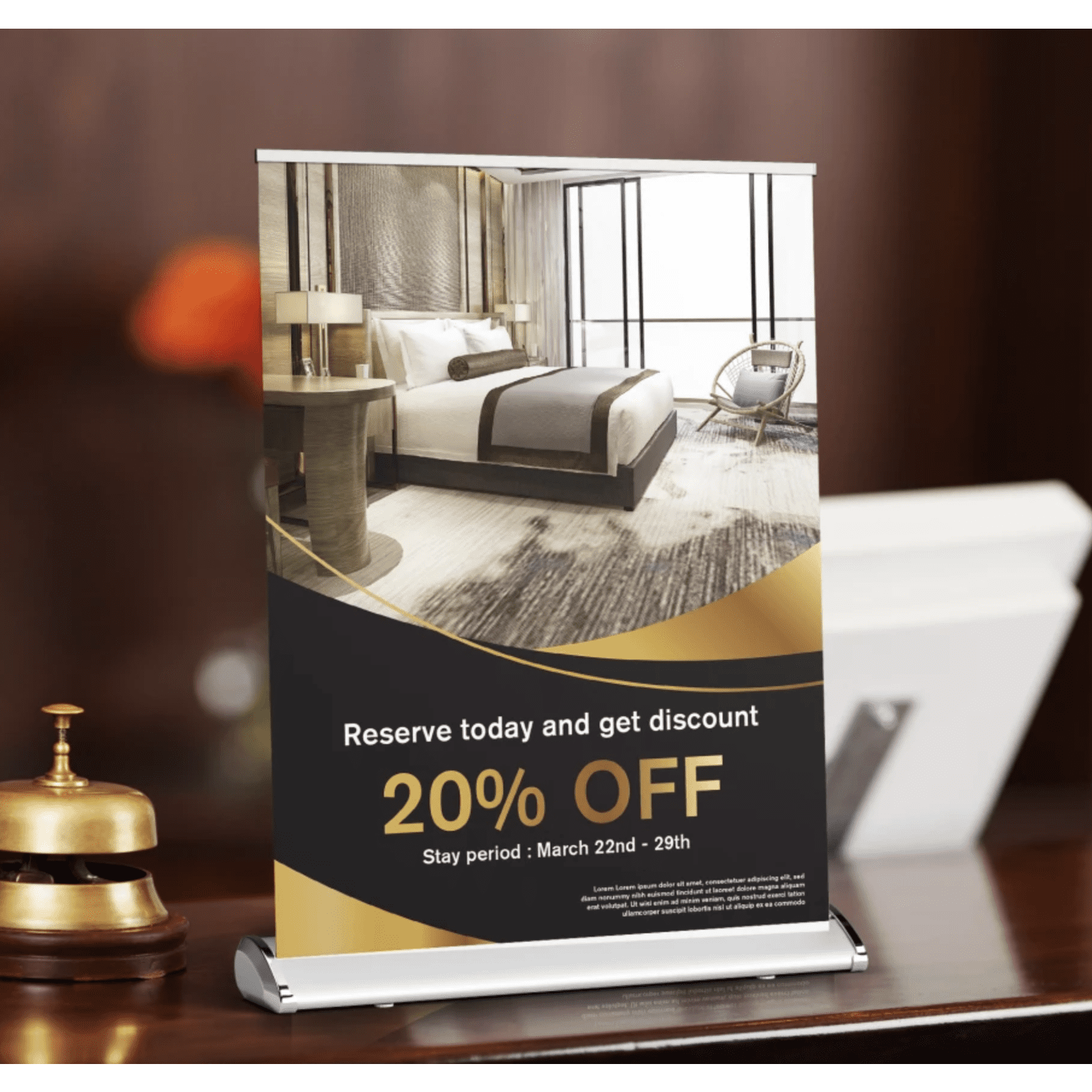 Desktop banners showcase your message in a compact and portable format. With our full-colour printing, this small roller banner is designed to make a big impact no matter how small the space is.