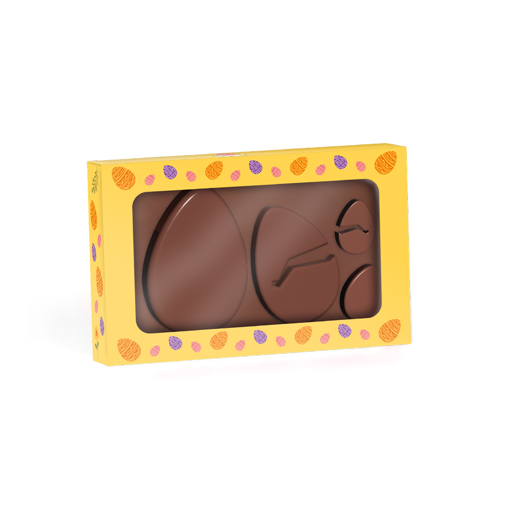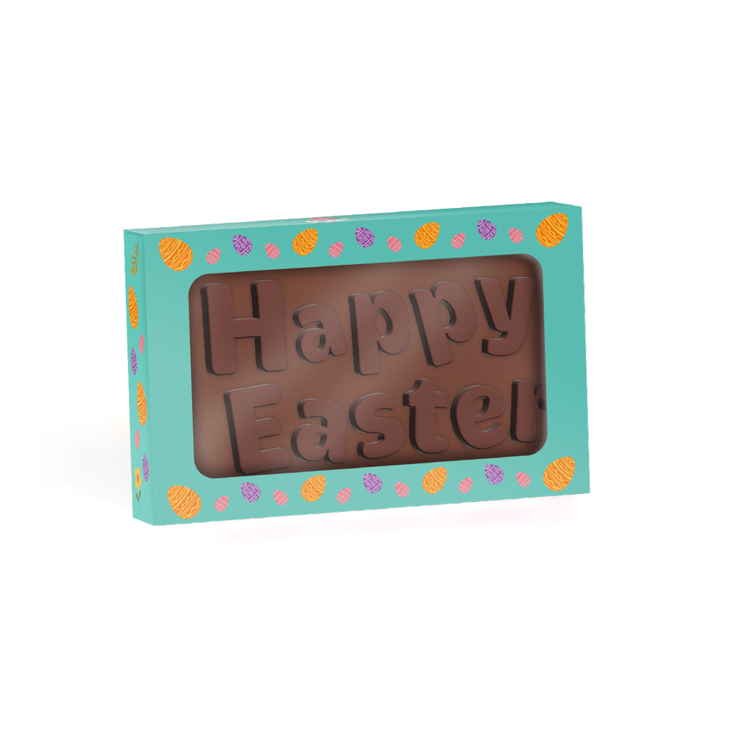 A decadent 3D moulded milk chocolate bar, elegantly presented in a recyclable clear film and housed within an eco-friendly, full-colour branded window box.
