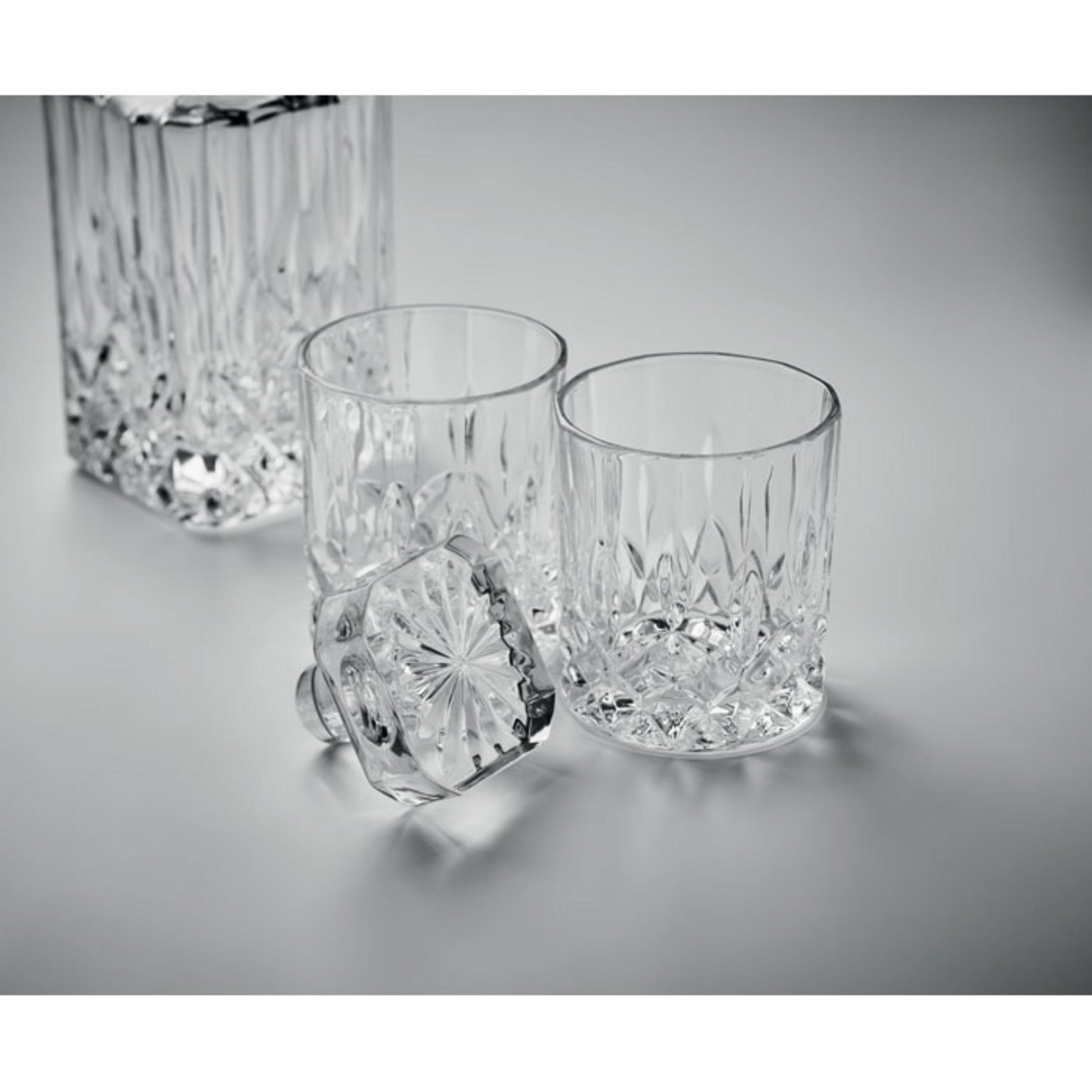 Inside this finely crafted wooden crate tray, your recipients will discover a meticulously curated whiskey ensemble. It features a 700ml glass decanter that's both a work of art and a vessel of flavor, accompanied by two 300ml whiskey glasses designed for true connoisseurs. To complete the set, there are six reusable stone ice cubes and a pair of tongs for the perfect serve.