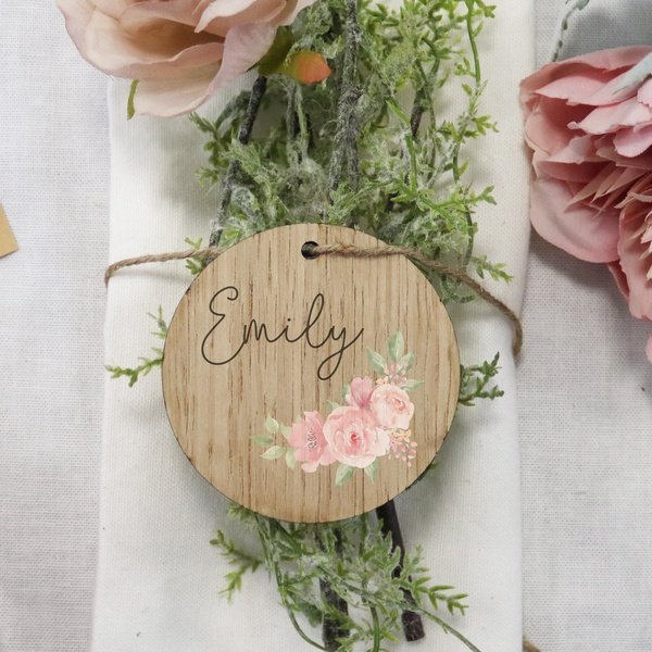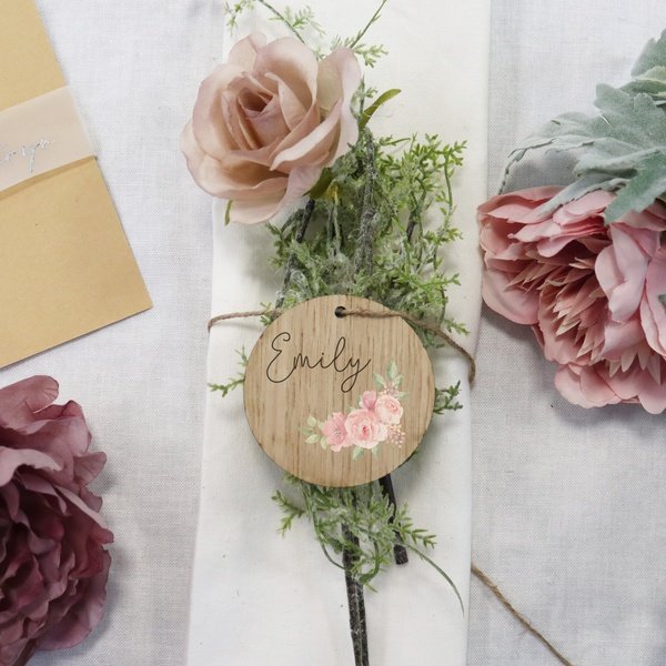 You can opt for the round to be cut with or without a hole. They can be simple placed on to a napkin or plate or if you would prefer come with a hole for you to add a ribbon or string of your choice so they can be used as a napkin holder or tied to a wine glass for a glass charm.