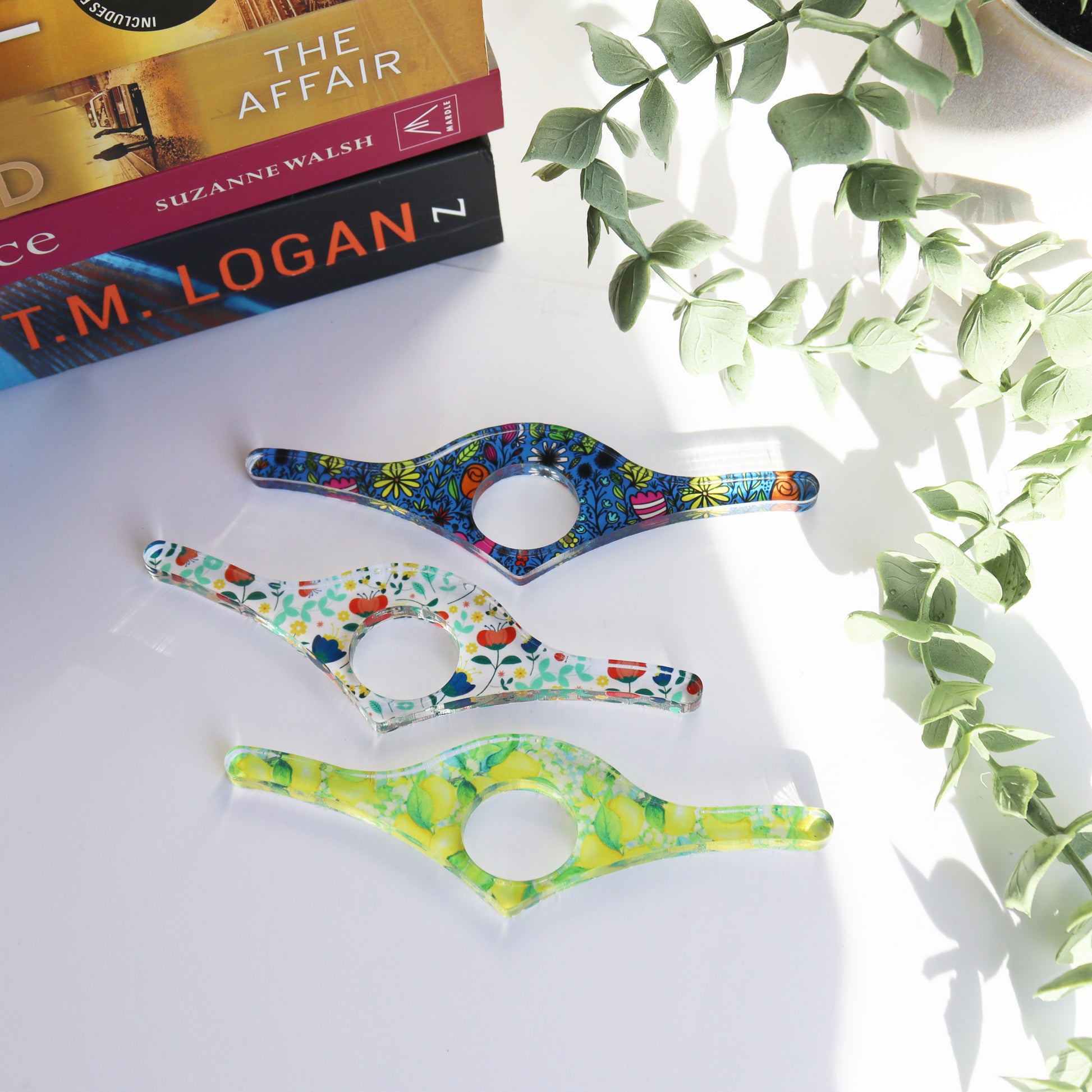 This book buddy or thumb book page holder is great for book lovers, especially when multitasking while reading. It helps to keep your book open comfortably for one handed reading. A lovely practical gift for avid readers and bookwormsThey make perfect little gifts for yourself or family and friends.All made from recycled scrap acrylic to reduce any effect on our environment and printed.