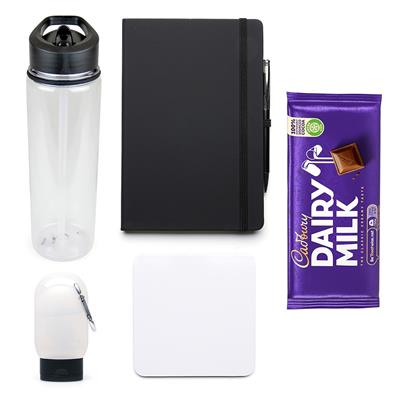 Elevate your corporate gifting with this sophisticated Promo Gift Set - Black, featuring a curated selection of practical, branded items. It includes the sleek Tarn Coloured Sports Bottle for hydration on the go, the stylish A5 Black Mole Duo notebooks for professional note-taking, a natural Square Cork Coaster to protect surfaces, the handy Paxton Sanitiser for cleanliness, and a luxurious corporate-branded Chocolate Bar to delight the senses. Perfectly tailored to leave a lasting impression, this set combines elegance with everyday utility, making your brand stand out with refined taste.