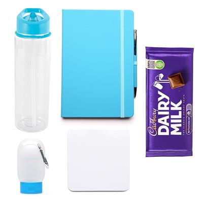 Elevate your corporate gifting with this sophisticated Promo Gift Set - Blue, thoughtfully curated to impress new starters and valued clients alike. Featuring the sleek Tarn Coloured Sports Bottle, practical A5 Mole Duo notebooks, elegant Square Cork Coaster, effective Paxton Sanitiser, and a luxurious Chocolate Bar, each item is subtly branded to reinforce your company’s presence. This set combines style and utility, making every recipient feel appreciated while promoting your brand with refined professionalism.