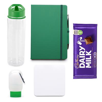Elevate your brand with this sophisticated Promo Gift Set in Green, thoughtfully curated to leave a lasting impression. Featuring the sleek Tarn Sports Bottle, the stylish A5 Mole Duo notebooks, a natural Square Cork Coaster, practical Paxton Hand Sanitiser, and a deliciously branded Chocolate Bar, each item is elegantly customized with your logo. Perfect for welcoming clients or rewarding employees, this set combines functionality and refined taste to enhance your corporate image.