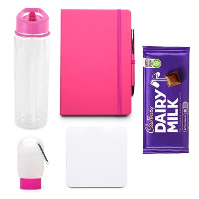 Elevate your brand with this sophisticated pink Promo Gift Set, featuring carefully selected items that blend style and practicality. It includes the elegant Tarn Smoked Sports Bottle, the sleek A5 Mole Duo notebooks, a natural Square Cork Coaster, the convenient Paxton Sanitiser, and a decadent branded Chocolate Bar. Each piece is expertly customized with your logo, making it an ideal refined corporate gift that leaves a lasting impression.