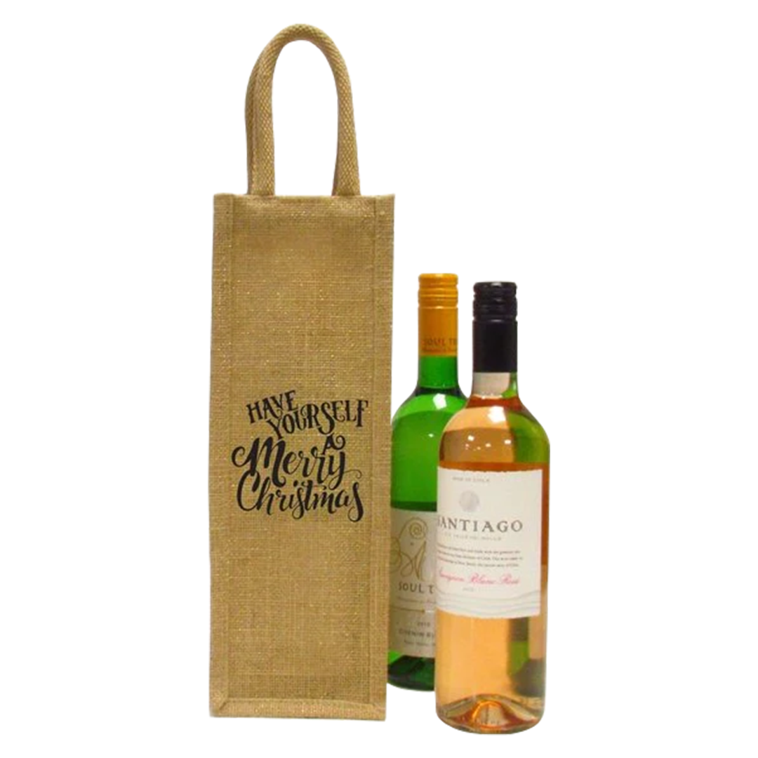 Our single bottle jute bags can be printed with your company logo or design or a message. These are limited to one colour print - black always works well.  We can do two colour print if the design is simple.