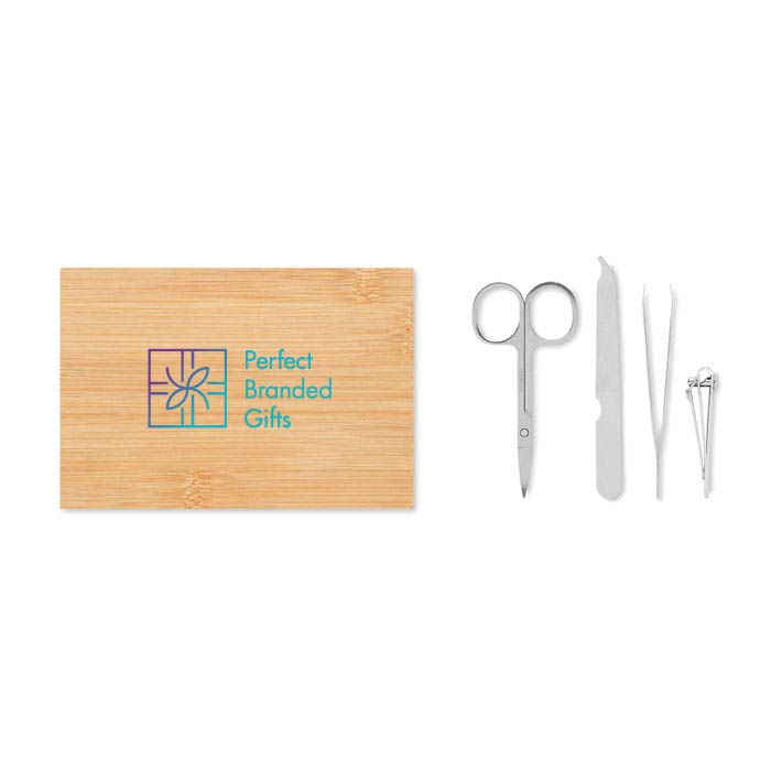 Indulge in luxury and pamper your nails with this branded Wooden Nail Tool Kit. This exquisite set includes a curved nail scissors, nail clippers, nail file, and tweezers, all made of high-quality stainless steel. The beautiful bamboo case, with its magnetic closure, adds a touch of elegance to your manicure routine. Elevate your self-care game and enjoy perfectly groomed nails with our exclusive set.